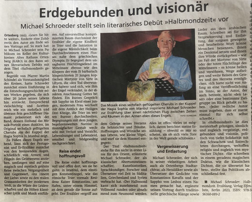 Der Titel »Halbmondzeit« stehe für ihn nicht in erster Linie für den Orient, erläuterte Michael Schroeder, der als klassischer Altertumswissenschaftler, Kunsthistoriker, Sprachkundiger, Forscher und Übersetzer viel Zeit in Süditalien, Griechenland und Syrien verbracht hat. »Der Halbmond kann sich zunehmend zum Vollmond runden oder abnehmend zum Neumond werden. Alles ist offen, vieles ist möglich, davon berichtet meine Erzählung - obwohl es mir so scheint, als ob sich viele Tore in der Welt gerade schlössen.«